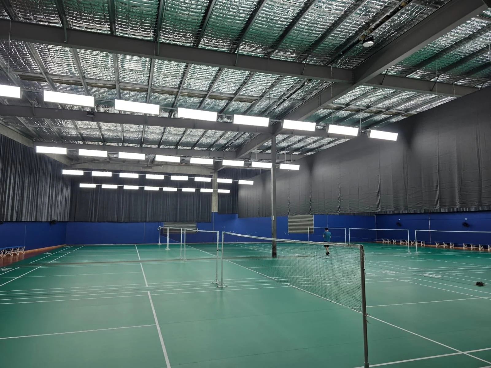 Indoor badminton courts with players practicing under fluorescent lighting in a large warehouse-like facility.