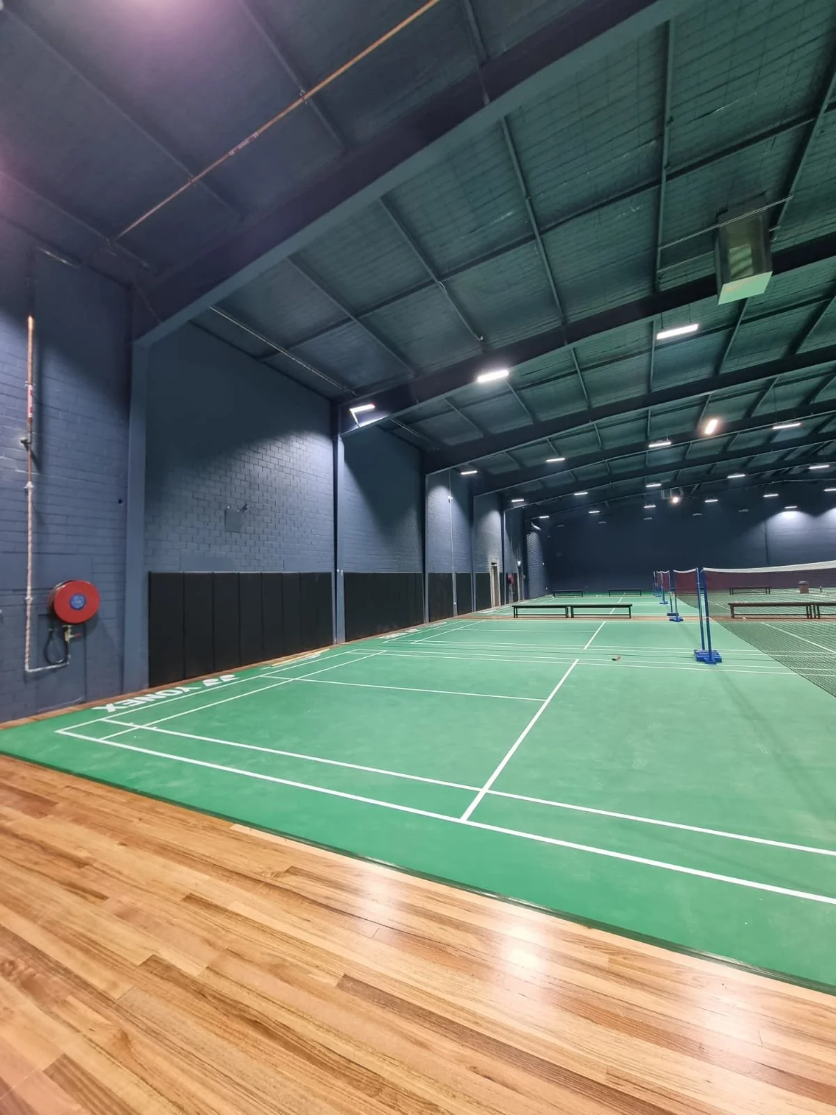 Indoor badminton court with seating area, wooden flooring, numbered courts, and a netted divider.